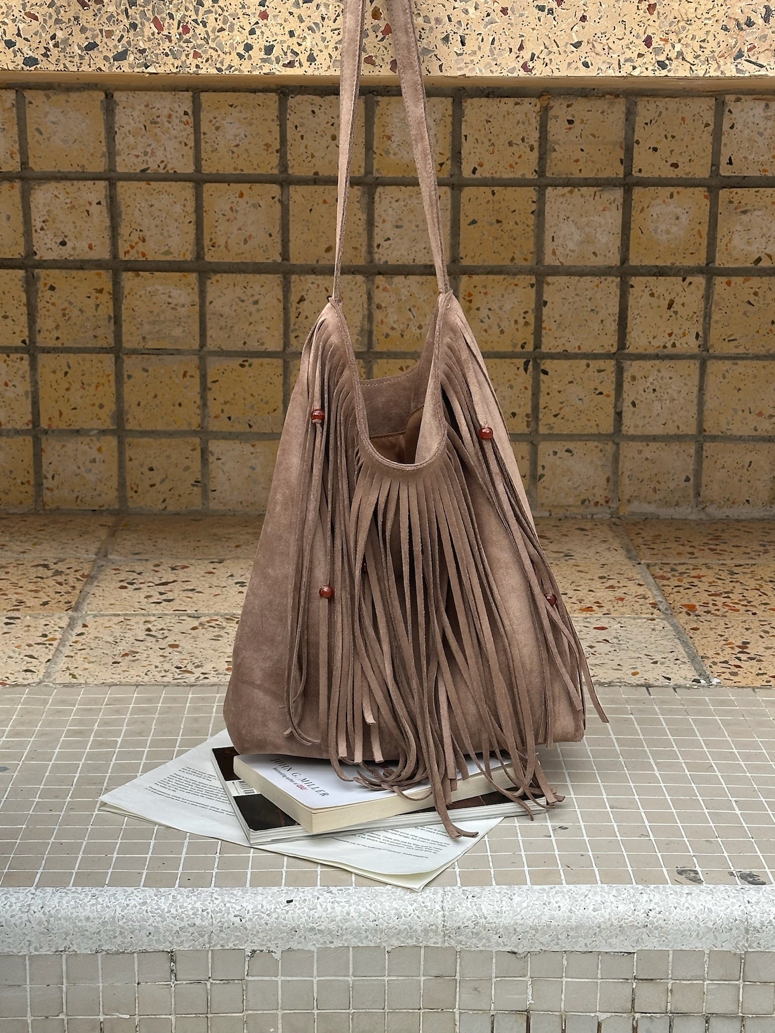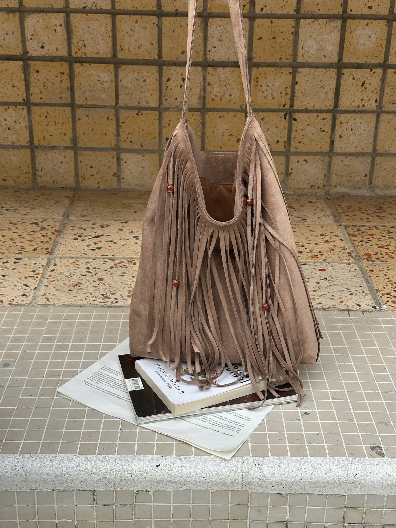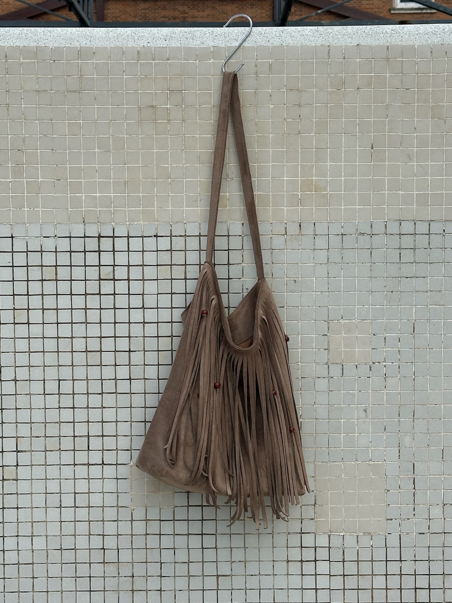 (클레이) 라지 스웨이드 프린지 비즈 버킷백 - 테네라 보헤미안 컬렉션