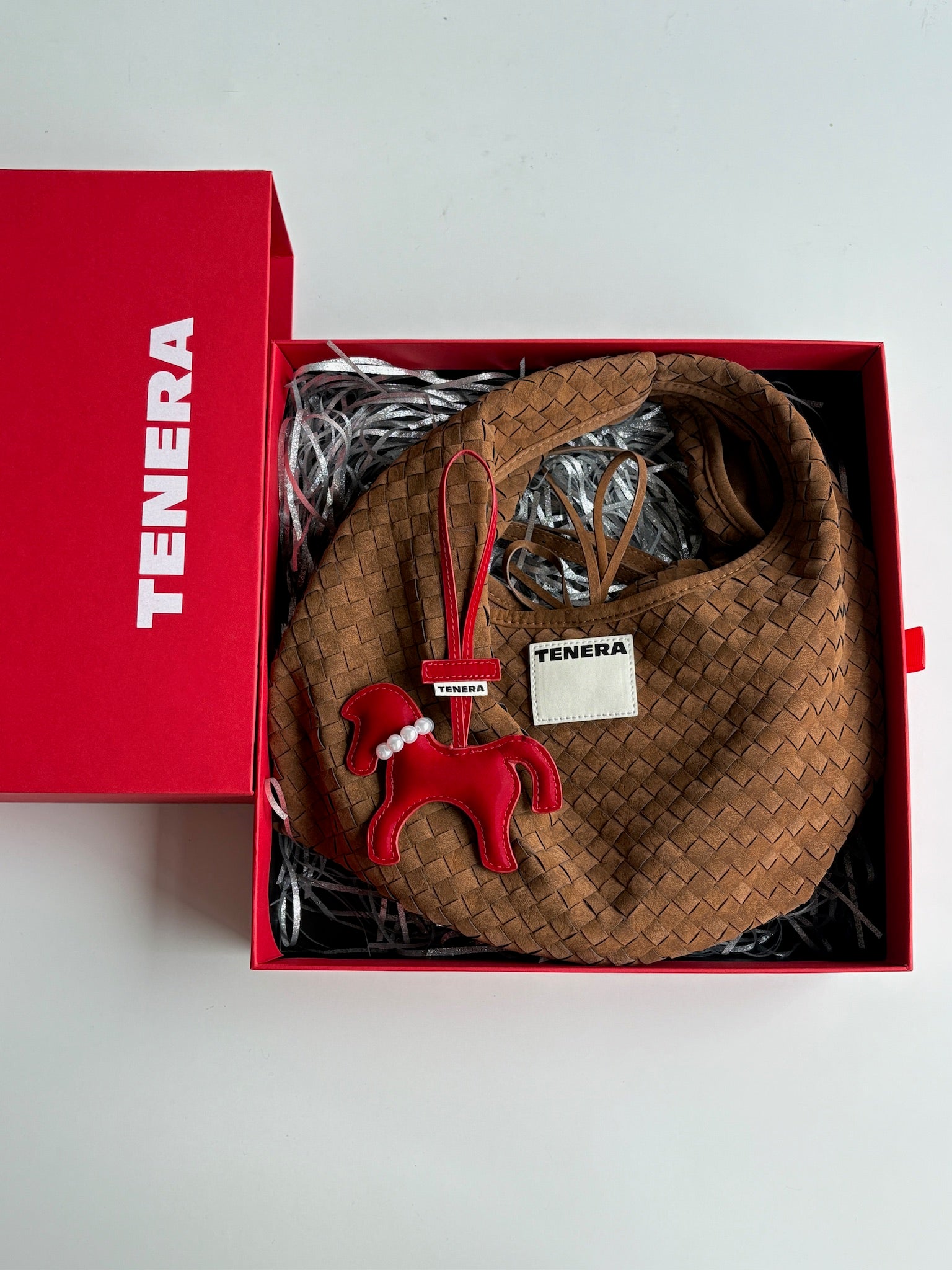This limited edition gift set features a stylish mini suede woven bag paired with a charming pony charm. Customers can choose from the following color options: